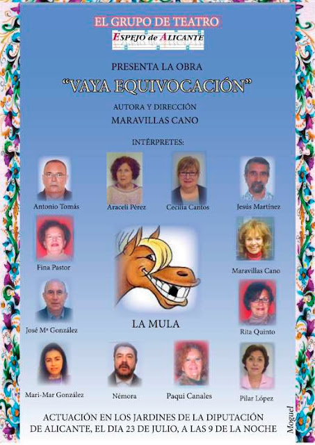 Jueves, 23 de Julio; Nuestro grupo de teatro va a actuar en los jardines de la Diputación, a las 21 horas, con la obra: ¡Vaya equivocación!, obra original y dirigida por Maravillas Cano. Si queréis pasar un ratito divertido al aire libre, ya sabéis dónde podéis acudir.