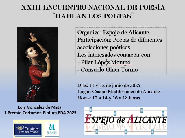 - Lunes, 9 de junio de 2025.- 18,30 horas. Recital y entrega de premios del V CERTAMEN INTERNACIONAL CON LA ESTROFA JULIA, V CERTAMEN DE POESÍA ESPEJO DE ALICANTE y VI CERTAMEN DE PINTURA Y ESCULTURA ESPEJO DE ALICANTE. Los poetas premiados recitarán sus poemas a lo largo del acto. Para finalizar tendremos un coctel de honor por gentileza del Casino Mediterráneo de Alicante.